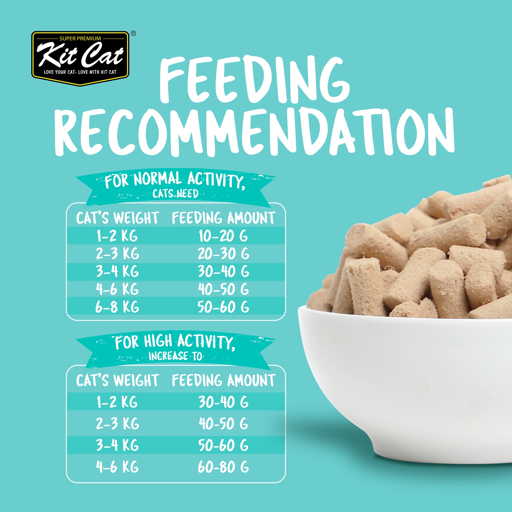 Kittens need twice the adult amount for their weight. Adjust feeding for pregnant, nursing, or less active cats as needed. Use this as a general guide and monitor your cat’s condition. Always provide fresh water.