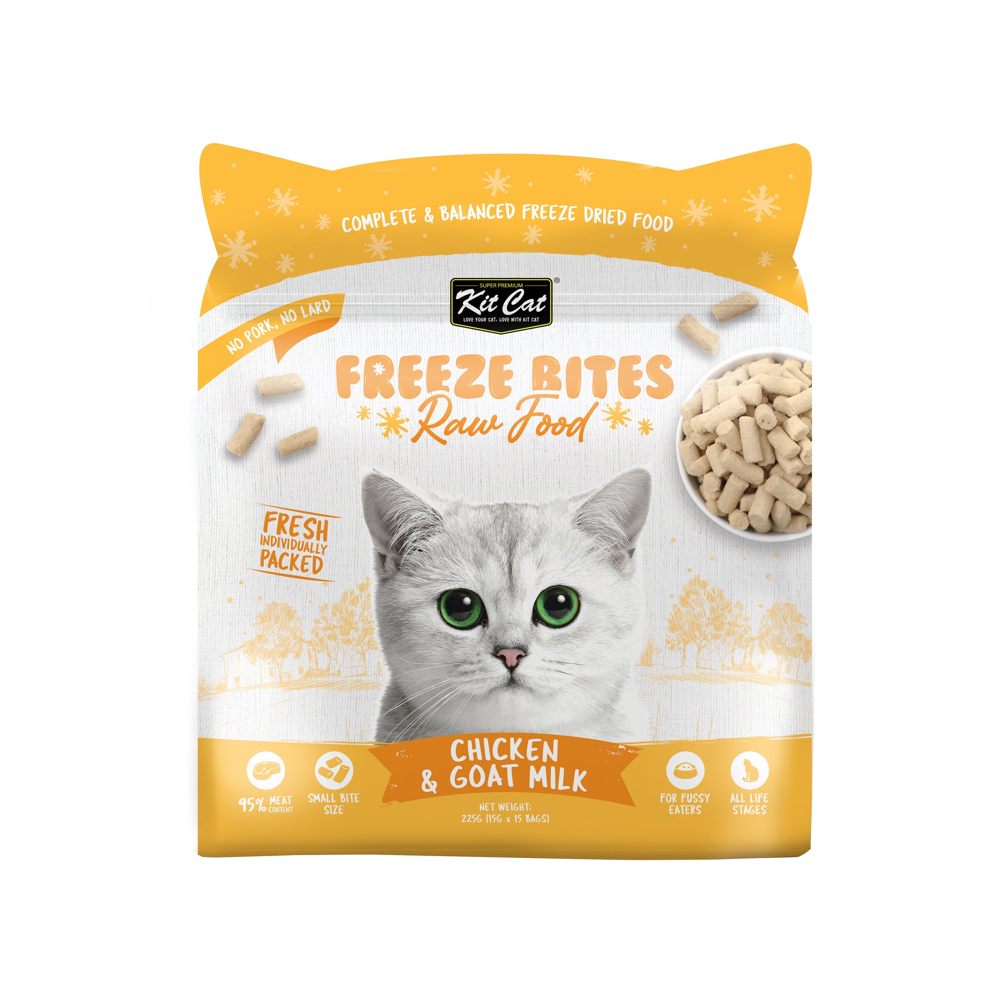 Kit Cat Freeze Bites Raw Food for Cats - Chicken & Goat Milk (225g) | 15 Packs